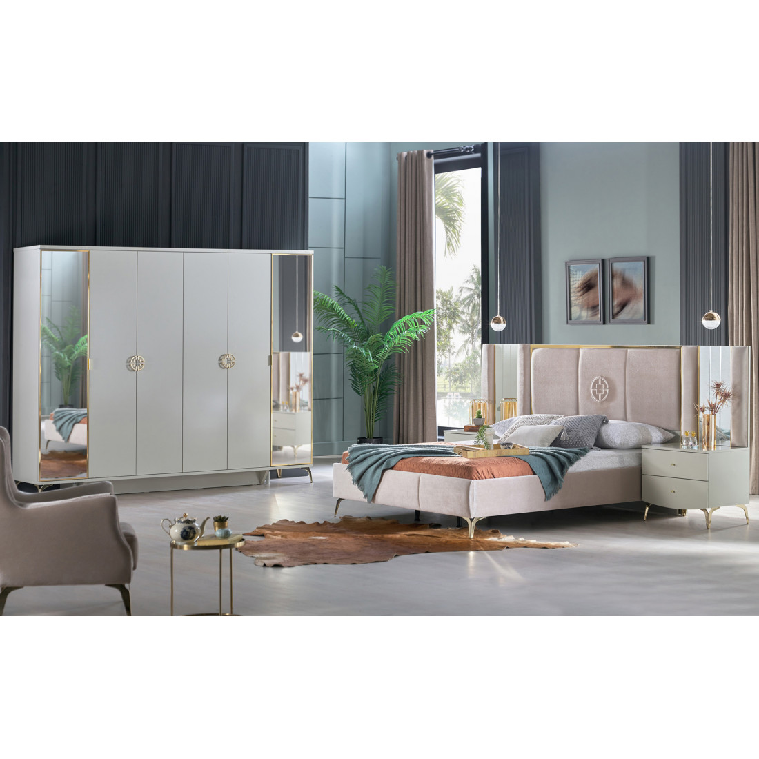 Спинка кровати щитовой конструкции из облицовочной плиты ДСП, с боковым и верхним накладным декоративным профилем (плита МДФ), профиль декорирован фитилем в цвете золота.